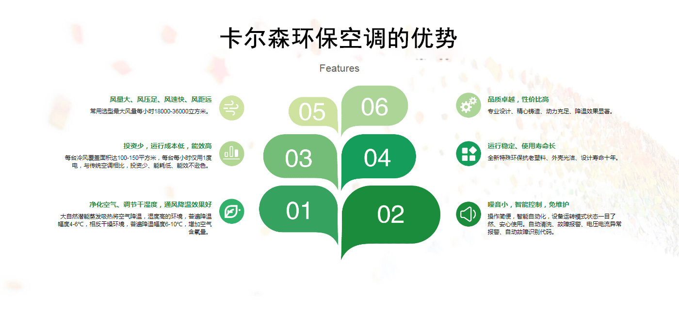 應用范圍: 適用于高溫或有異味的車間:熱處理廠、鑄件廠、塑料廠、鋁型材廠、制鞋廠、皮件廠、電鍍廠、印染廠等各種化工廠等。 適用于勞動密集型企業:服裝廠,各類裝配車間,網吧等。 適用于需要降溫又需要一定濕度的場所:棉紡廠、毛紡廠、麻紡廠、織布廠、化纖廠、經編廠、加彈廠、針織廠、絲織廠、襪廠等各類紡織廠。 適用于:倉儲物流領域、園藝溫室大棚通風降溫、畜牧場降溫等場所。 全國服務熱線:13960350919
